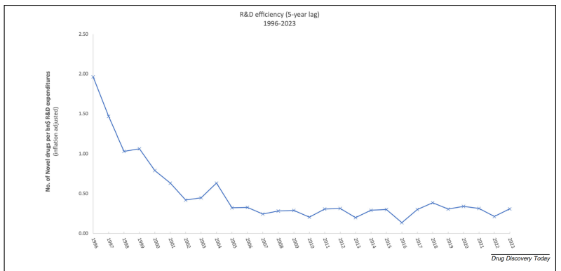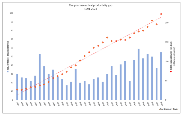 Vấn đề năng suất trong nghiên cứu và phát triển (R&D) dược sinh học đã được mổ xẻ và thảo luận trong nhiều nghiên cứu khác nhau qua các năm. Là lĩnh vực thâm dụng nghiên cứu nhất, ngành dược sinh học chi hàng tỷ USD vào việc phát triển các liệu pháp điều trị mới với tốc độ tăng trưởng liên tục. Trong 70 năm qua, năng suất R&D (được định nghĩa là số lượng thuốc mới được phê duyệt mỗi năm) tương đối dậm chân tại chỗ, trong khi chi phí cho mỗi loại thuốc mới bắt đầu tăng vọt từ năm 1970. Chi phí trung bình để phát triển một loại thuốc mới đã tăng từ mức dưới 1 tỷ USD vào những năm 1990 lên 3,5 tỷ USD hiện nay.
