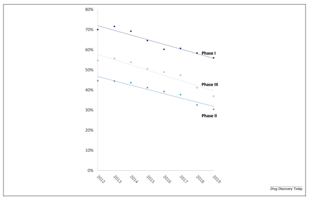 Xu hướng thành công của thử nghiệm lâm sàng theo từng giai đoạn (trong vòng 4 năm, đối với các thử nghiệm bắt đầu từ năm 2012 đến năm 2019). Tất cả các giai đoạn thử nghiệm lâm sàng đều cho thấy tỷ lệ bỏ cuộc ngày càng tăng qua các năm.