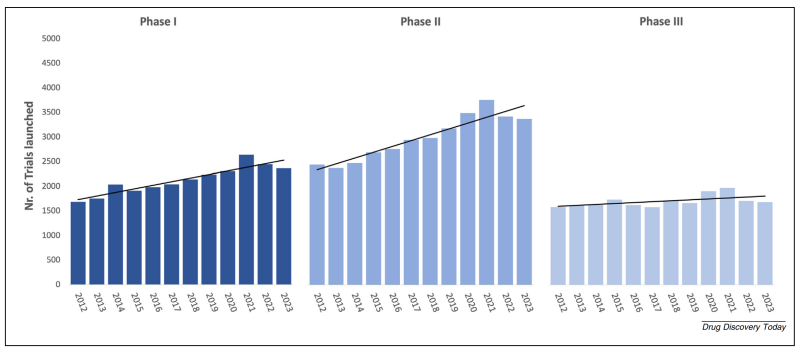 Số lượng thử nghiệm lâm sàng mới được khởi động hàng năm theo từng giai đoạn. Hình này minh họa xu hướng các thử nghiệm lâm sàng mới được khởi động mỗi năm, được phân chia theo giai đoạn thử nghiệm (Giai đoạn I,